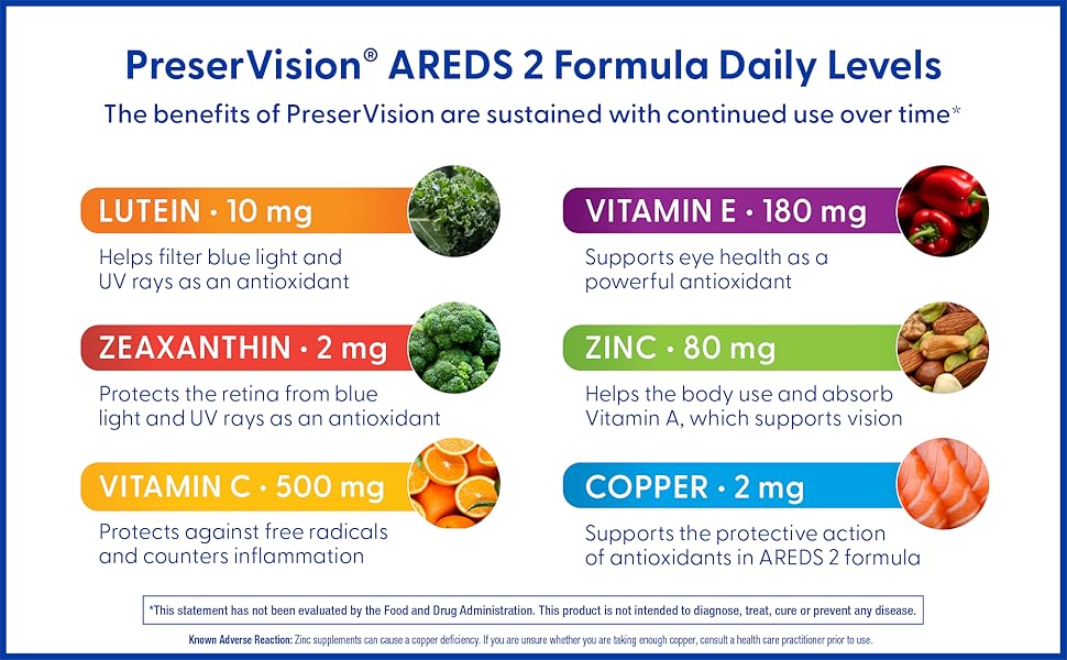 For best results, take two soft gels daily with food — one in the morning and one in the evening. This easy-to-follow routine ensures your eyes receive continuous nourishment throughout the day. Consistent use of PreserVision AREDS 2 helps maintain macular health, support sharp vision, and protect against oxidative stress caused by blue light and aging.